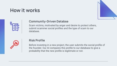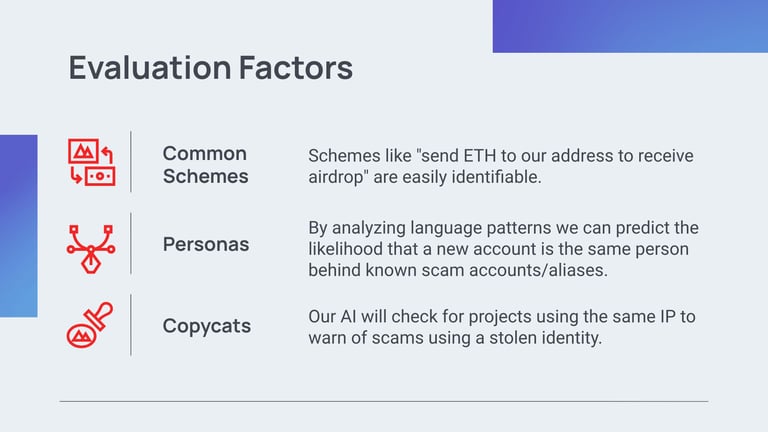Rugpool uses AI to evaluate the social media accounts of people launching or promoting a token. Based on key factors such as content originality and impersonation attempts, RugPool provides a risk score and highlights suspicious activity.